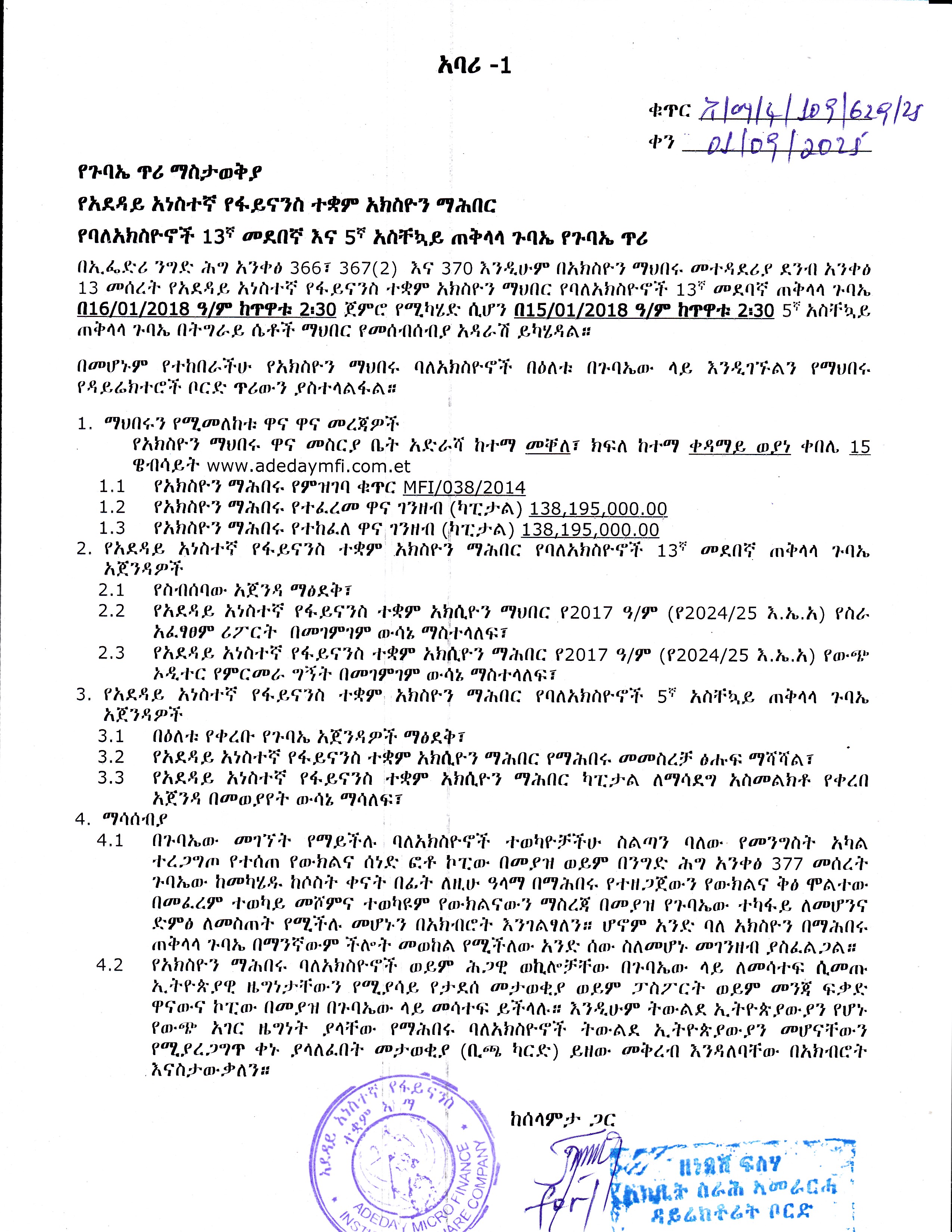በኢፌድሪ ንግድ ሕግ አንቀፅ 366፣ 367(2) እና 370 እንዲሁም በአክስዮን ማህበሩ መተዳደሪያ ደንብ አንቀፅ 13 መሰረት የአደዳይ አነስተኛ የፋይናንስ ተቋም አክስዮን ማህበር የባለአክስዮኖች 13ኛ መደባኛ ጠቅላላ ጉባኤ በ16/01/2018 ዓ/ም ከጥዋቱ 2፡30 ጀምሮ የሚካሄድ ሲሆን በ15/01/2018 ዓ/ም ከጥዋቱ 2፡30 5ኛ አስቸኳይ ጠቅላላ ጉባኤ በትግራይ ሴቶች ማህበር የመሰብሰብያ አዳራሽ ይካሄዳል። በመሆኑም የተከበራችሁ የአክስዮን ማህበሩ ባለአክስዮኖች በዕለቱ በጉባኤው ላይ እንዲገኙልን የማህበሩ የዳይሬክተሮች ቦርድ ጥሪውን ያስተላልፋል።